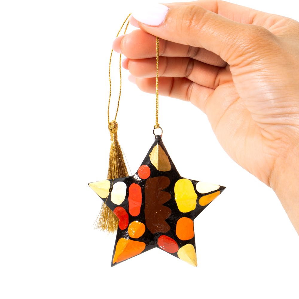This decorative hand painted and lacquered 3D Star ornament is made from recycled paper. Perfect for Christmas! The design is Ikuntji Artist Keturah Zimran's 'Puli Puli'.