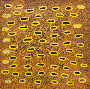 This painting depicts Wilkinkarra (Lake Mackay), the country and Tjukurrpa (Dreaming) of the artist's aunt, Ngoia Napaltjarri. It was handed down to Kathleen by her.