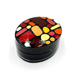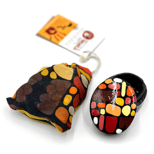 This pill box is handmade by Kashmiri craftswomen and men combining their traditional handicrafts with Aboriginal designs. The fairtrade product is licensed through Better World Arts using Keturah Zimran's 'Puli Puli - Stones' story.