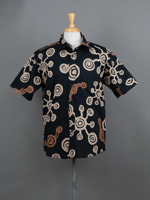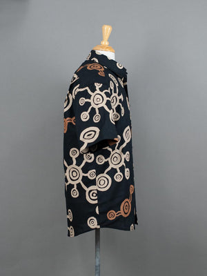 This shirt features Ikuntji Artist Hayley Dodd's Dalhousie Hot Springs design. This design is about the artist’s grandmother’s place. Her grandmother was born at Dalhousie Hot Springs, in the Witjirra NP, an oasis located at the edge of the Simpson Desert. It is south of Finke and West of Oodnadatta in South Australia.